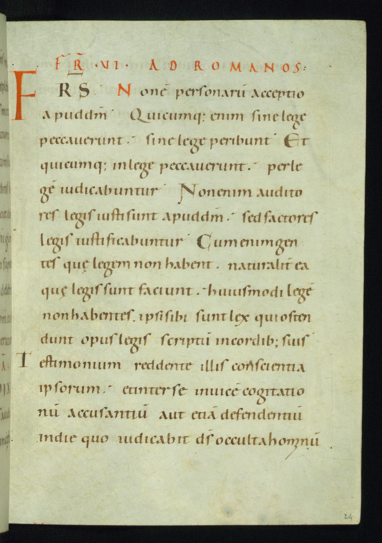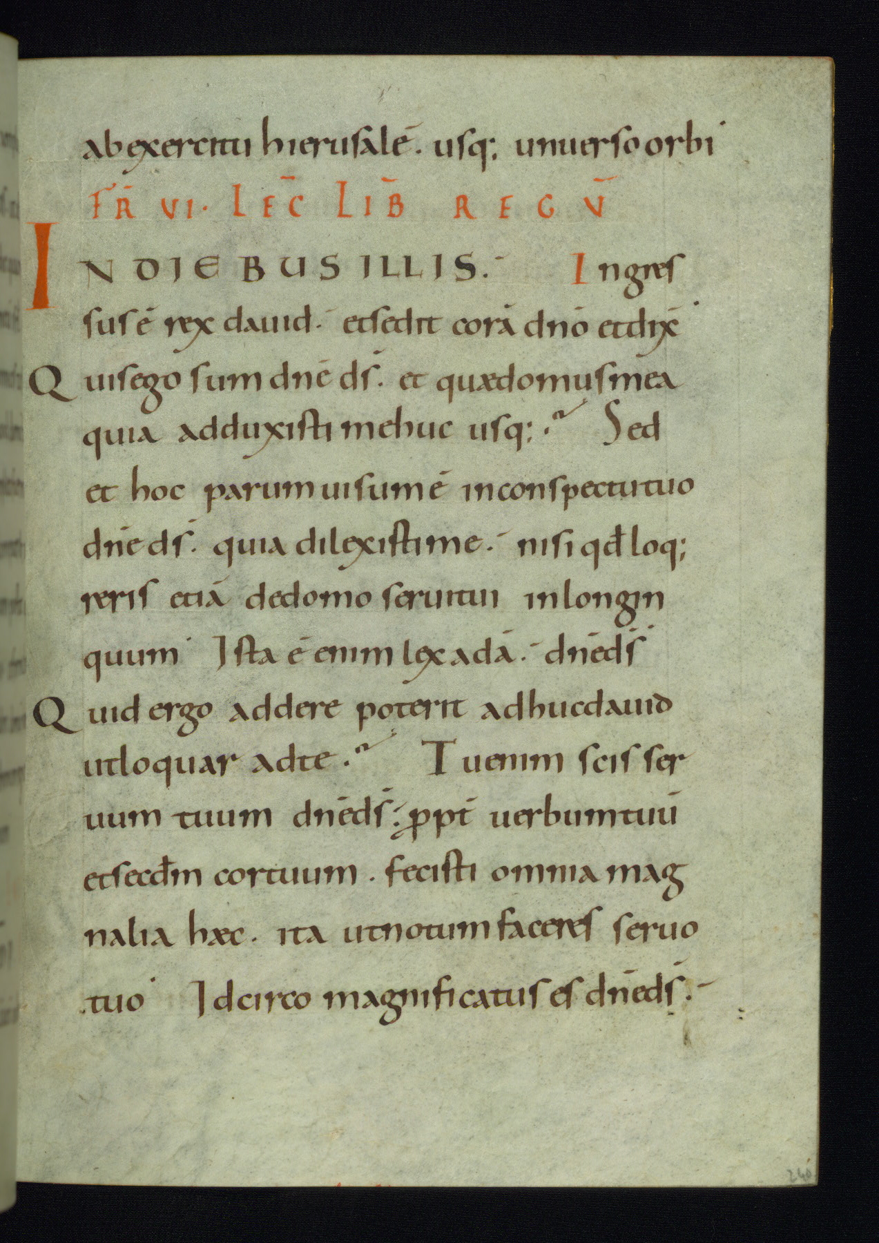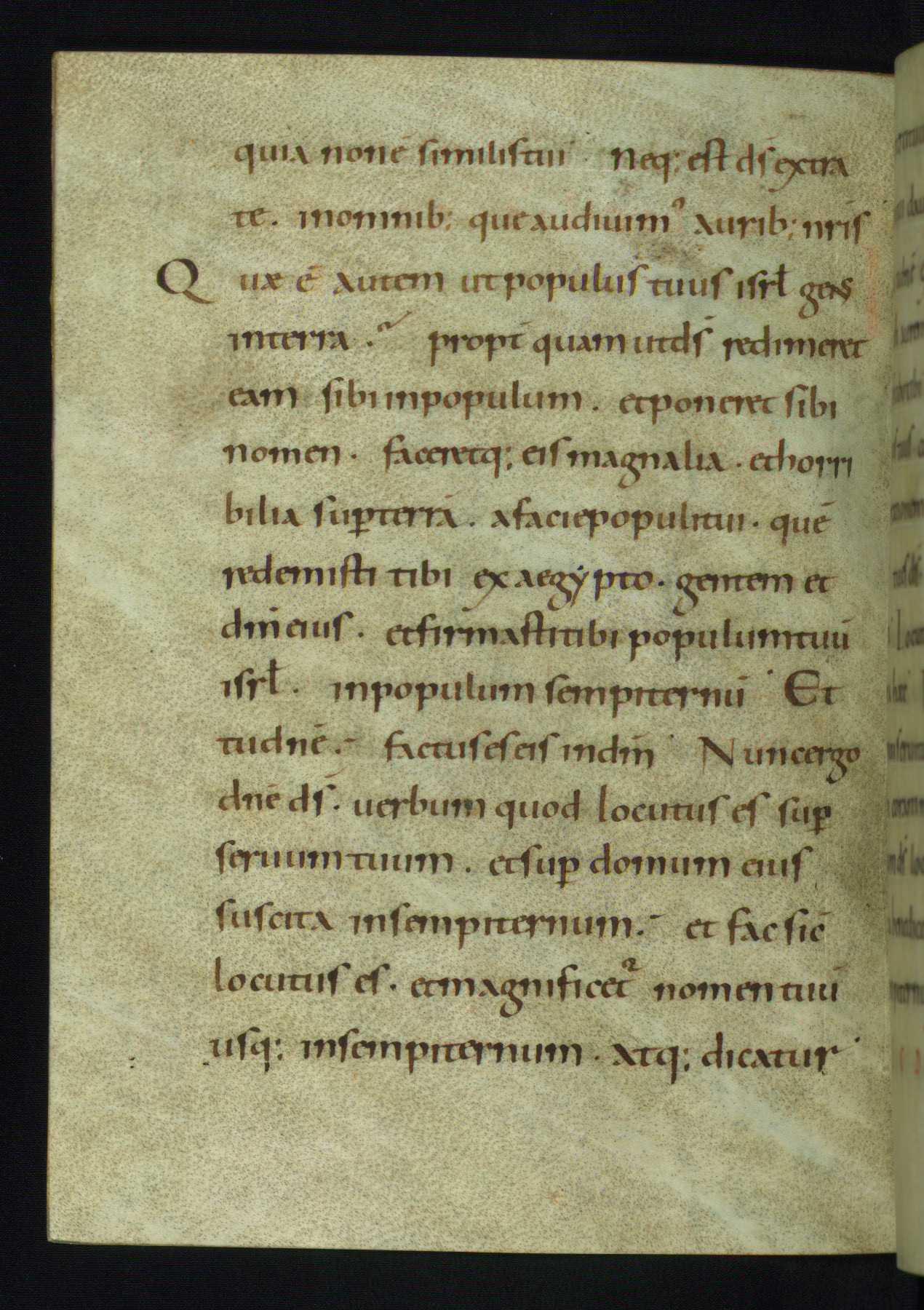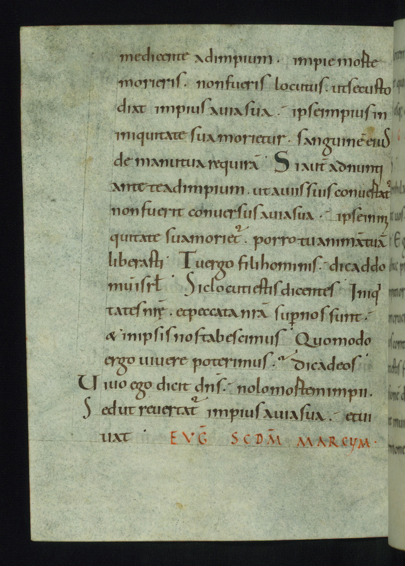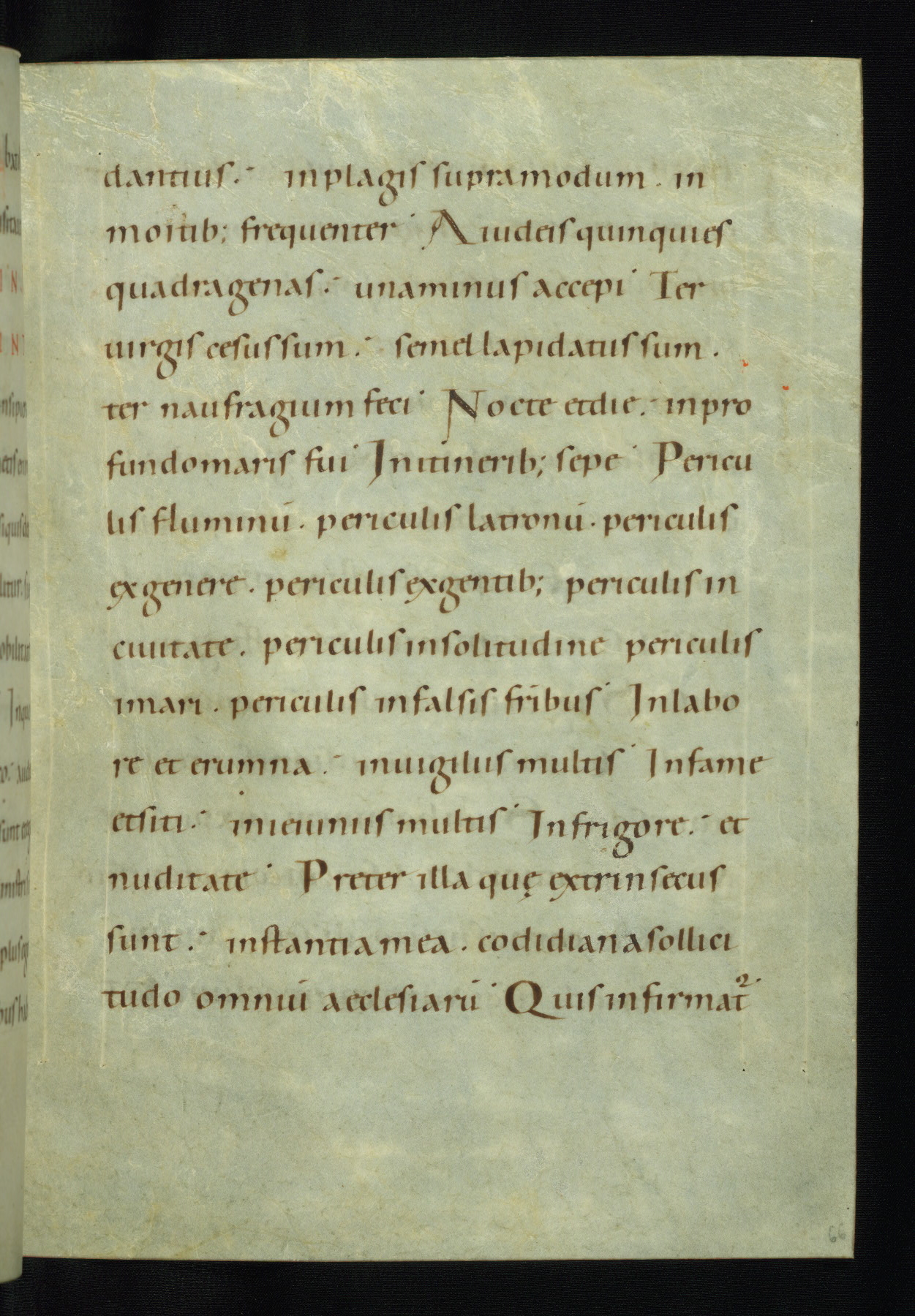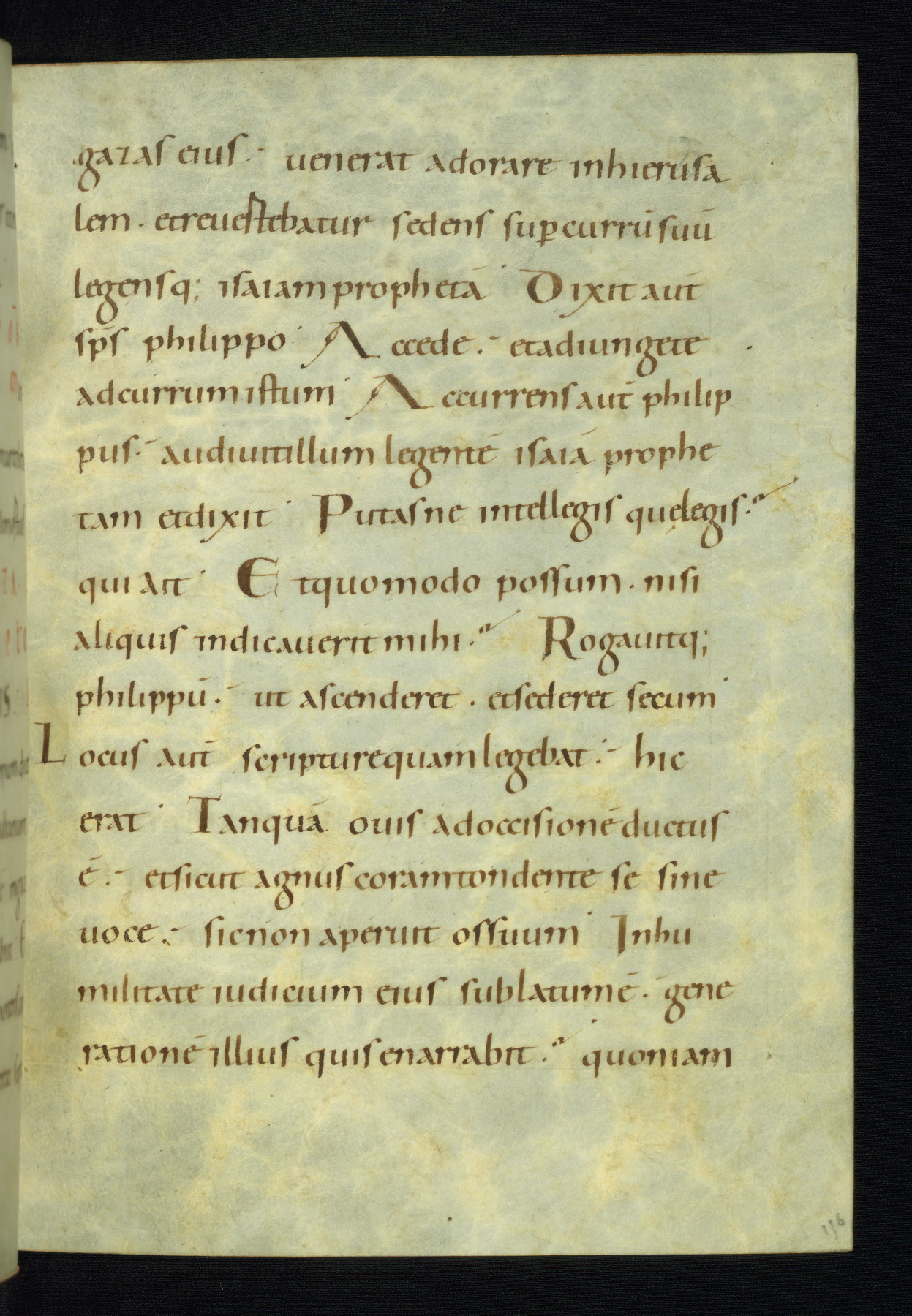 This Lectionary was created ca. 1000 in Trier. Written in a clear Caroline minuscule, it contains decorated initials at the openings of important readings. A set of illuminated letters marks the beginning of the Epistle and Gospel lessons for Easter; they display the hierarchy of scripts with capital letters decorated with gold leaf or drawn in red ink, followed by uncial and Caroline minuscule. Initials in orange, sometimes filled with gold, mark the divisions of the text. The book has been stylistically compared with Ottonian manuscripts, especially with a Psalter preserved in Trier (Stadtbibliothek, Ms. 7) illuminated by the so-called Master of the Registrum Gregorii.