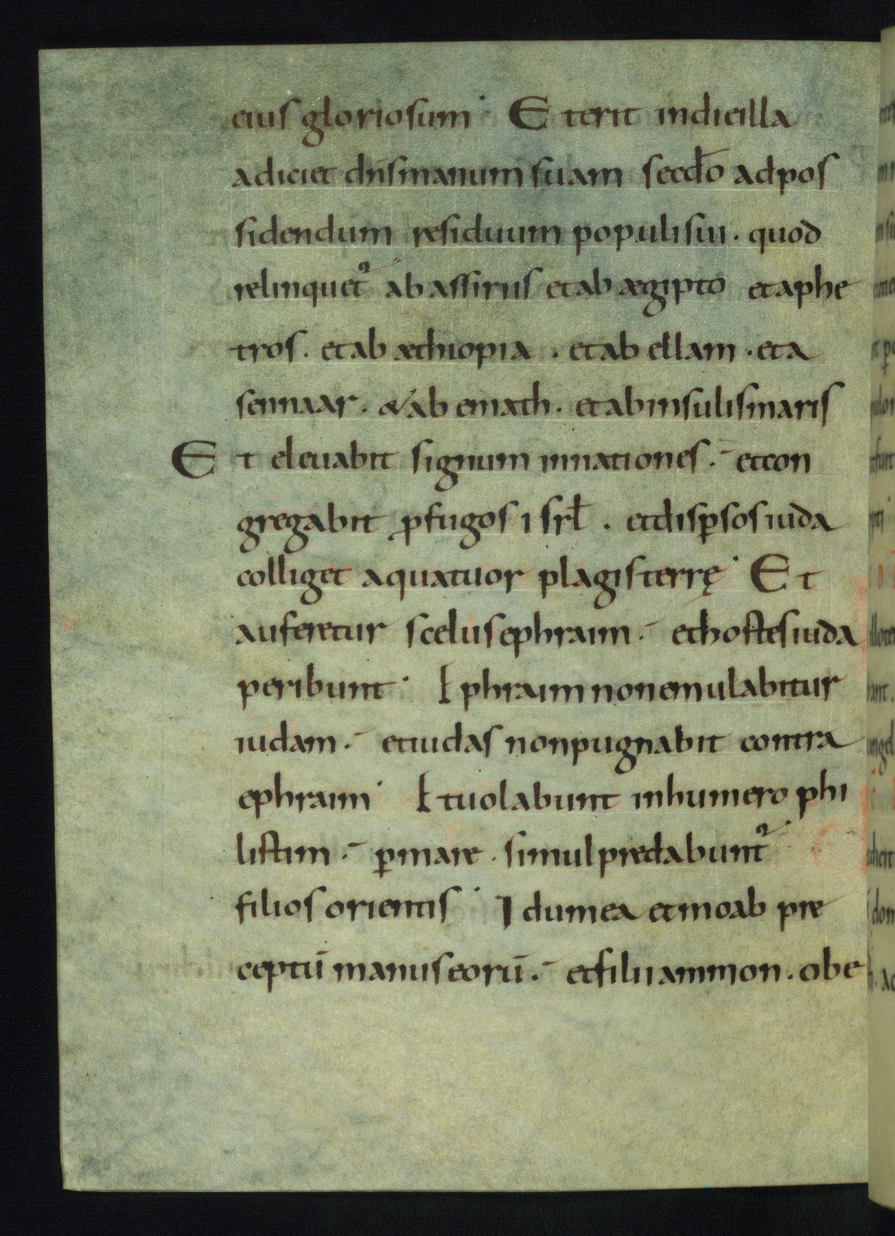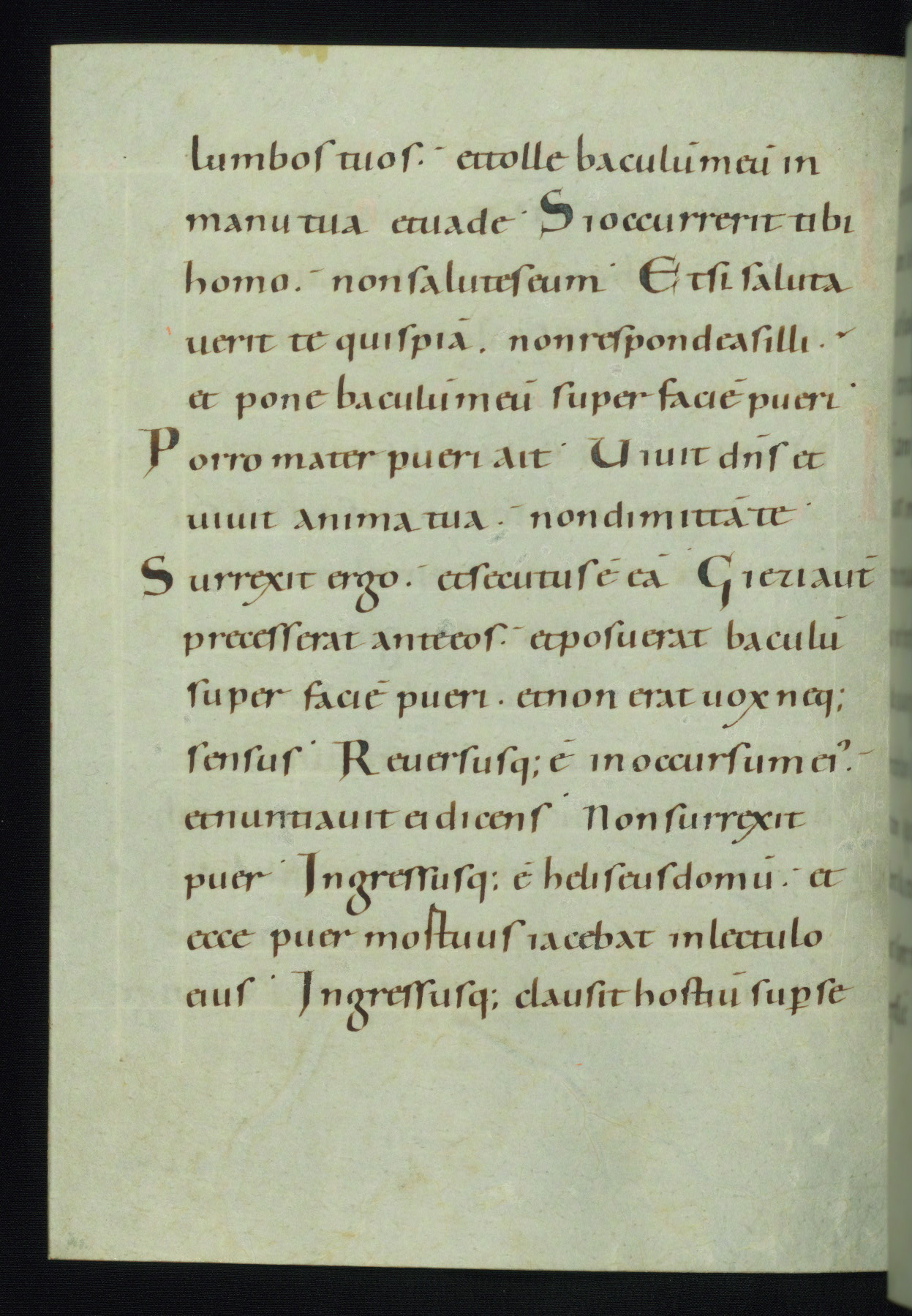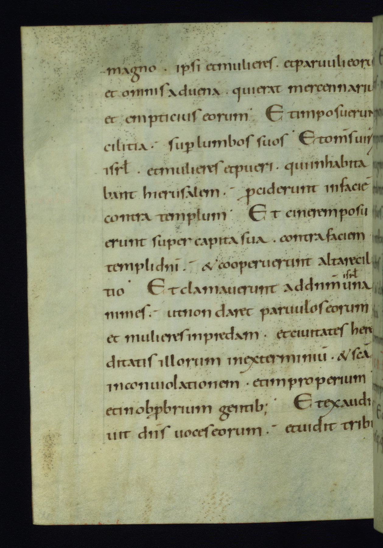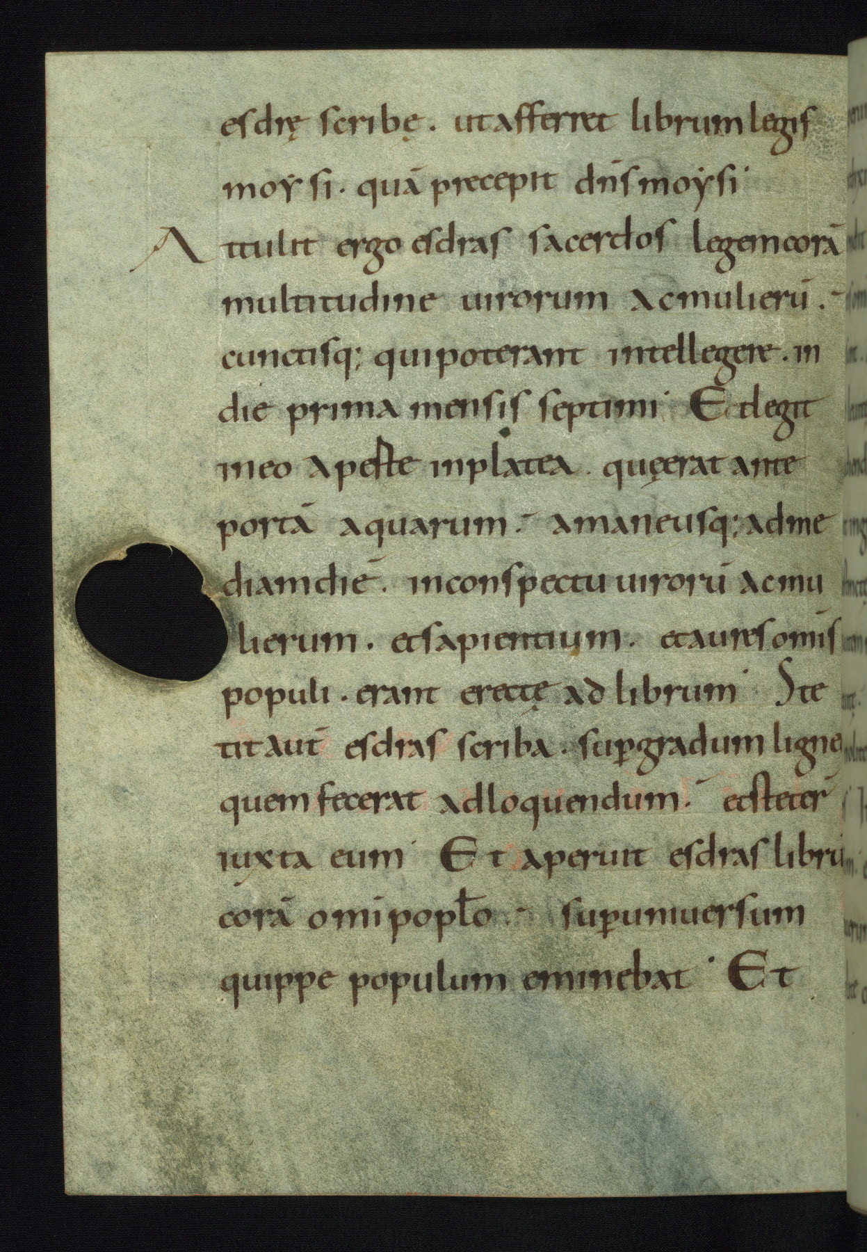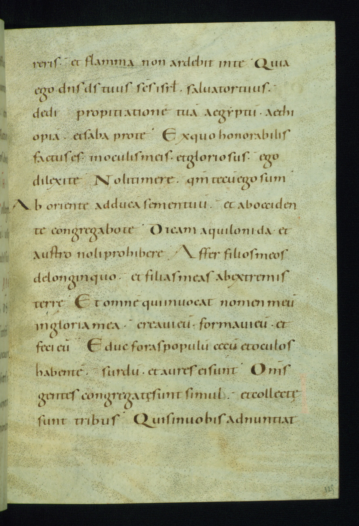 This Lectionary was created ca. 1000 in Trier. Written in a clear Caroline minuscule, it contains decorated initials at the openings of important readings. A set of illuminated letters marks the beginning of the Epistle and Gospel lessons for Easter; they display the hierarchy of scripts with capital letters decorated with gold leaf or drawn in red ink, followed by uncial and Caroline minuscule. Initials in orange, sometimes filled with gold, mark the divisions of the text. The book has been stylistically compared with Ottonian manuscripts, especially with a Psalter preserved in Trier (Stadtbibliothek, Ms. 7) illuminated by the so-called Master of the Registrum Gregorii.