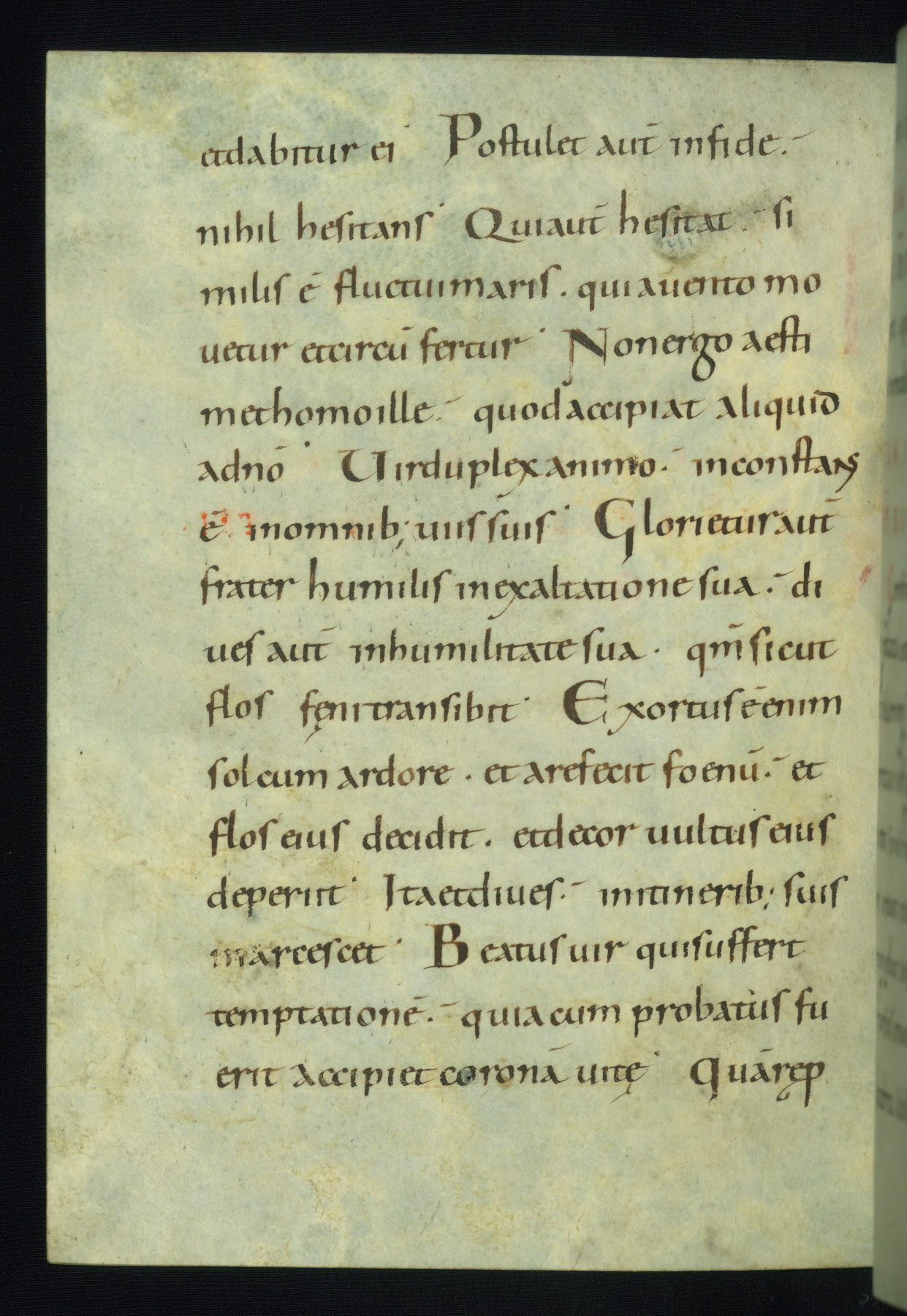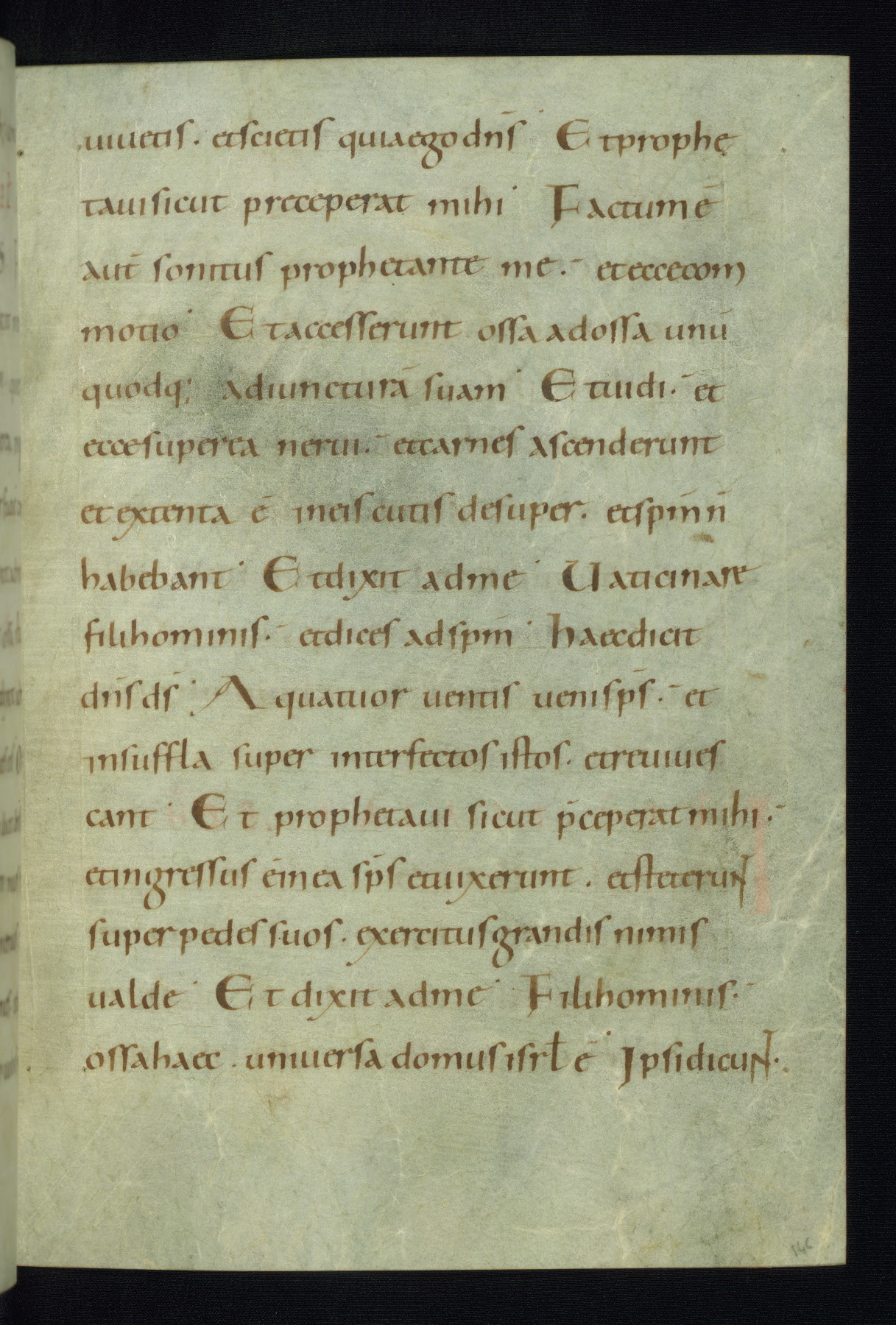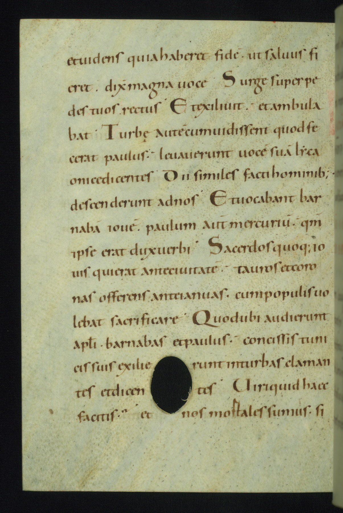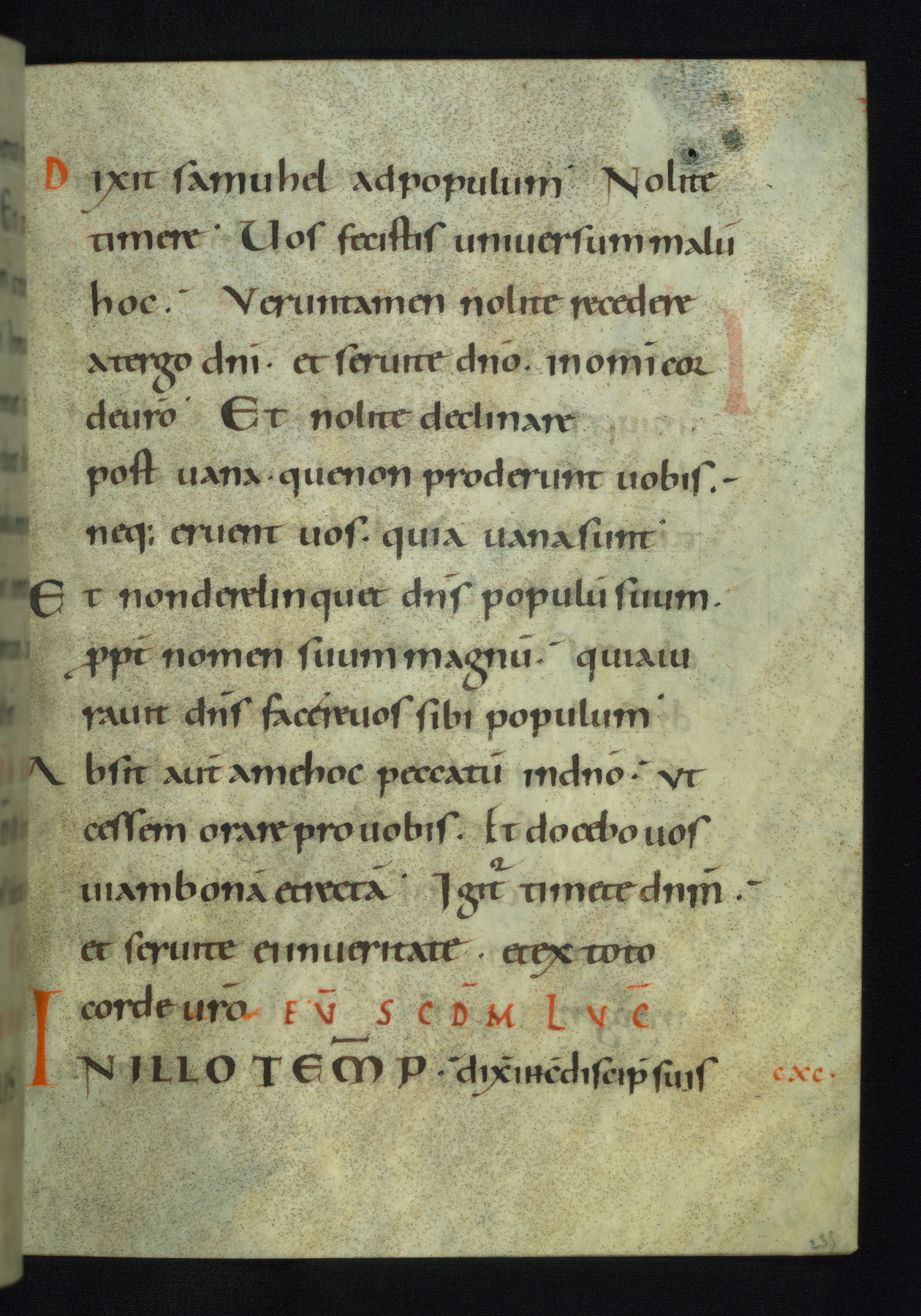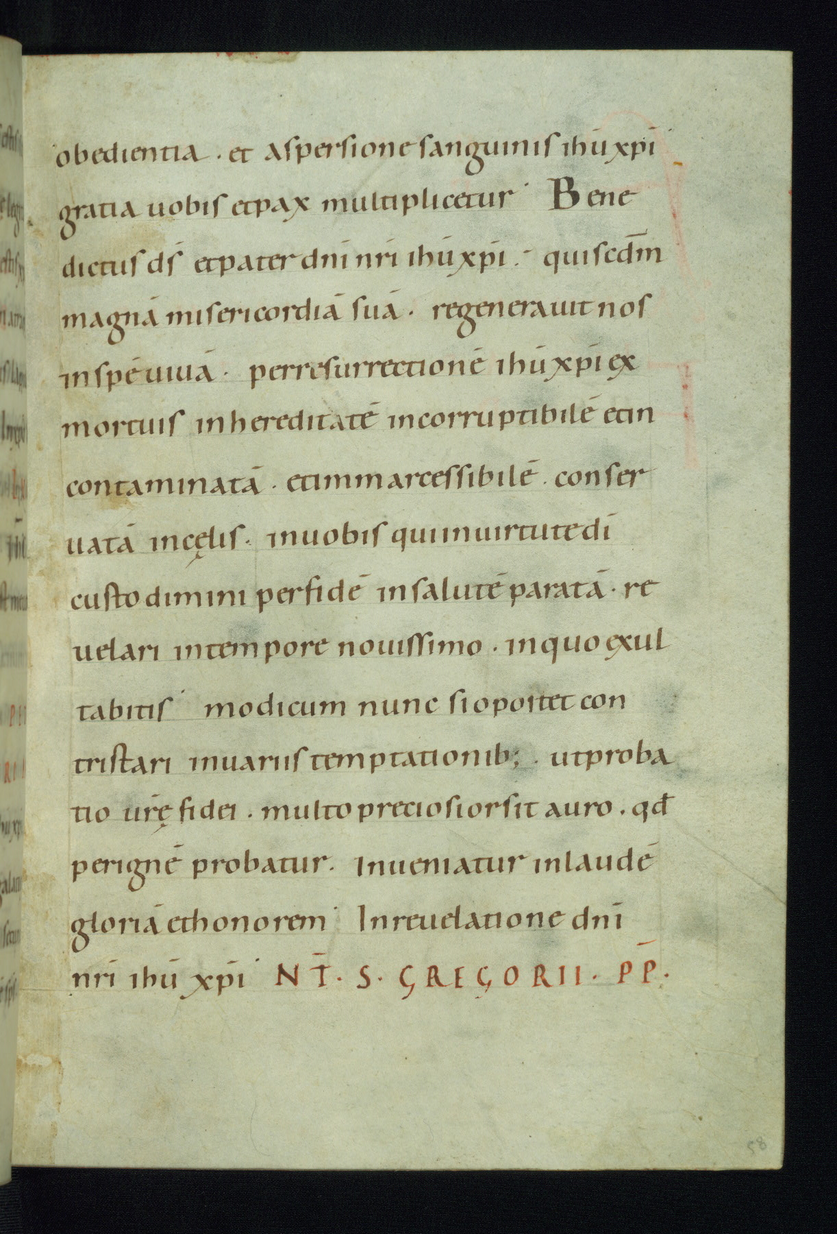 This Lectionary was created ca. 1000 in Trier. Written in a clear Caroline minuscule, it contains decorated initials at the openings of important readings. A set of illuminated letters marks the beginning of the Epistle and Gospel lessons for Easter; they display the hierarchy of scripts with capital letters decorated with gold leaf or drawn in red ink, followed by uncial and Caroline minuscule. Initials in orange, sometimes filled with gold, mark the divisions of the text. The book has been stylistically compared with Ottonian manuscripts, especially with a Psalter preserved in Trier (Stadtbibliothek, Ms. 7) illuminated by the so-called Master of the Registrum Gregorii.