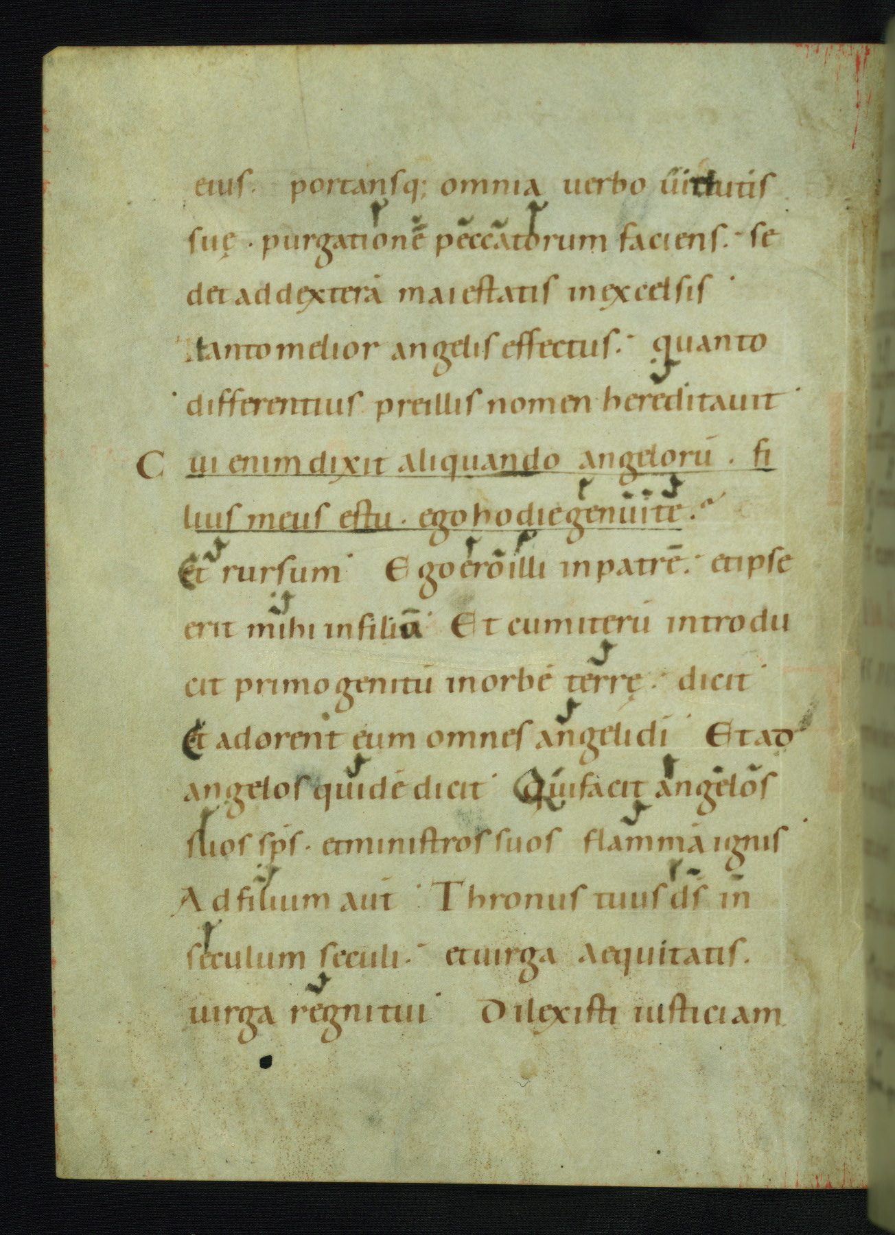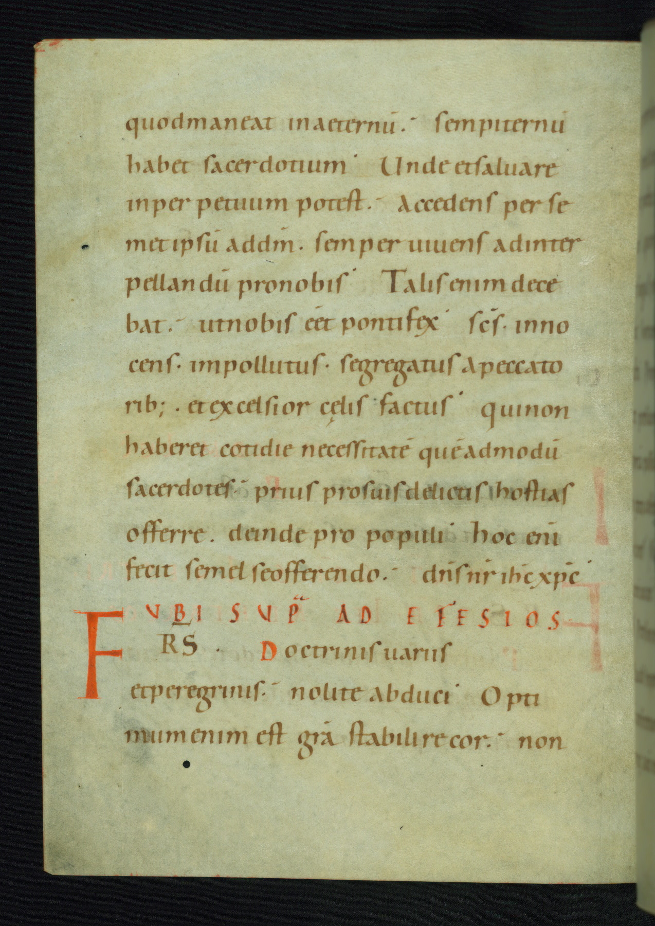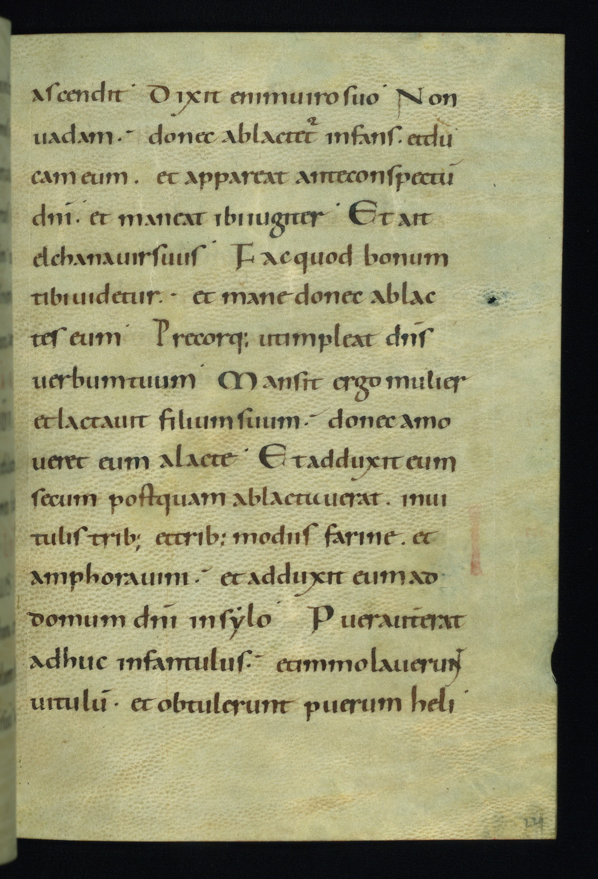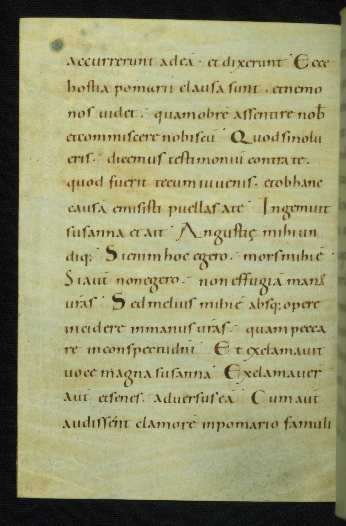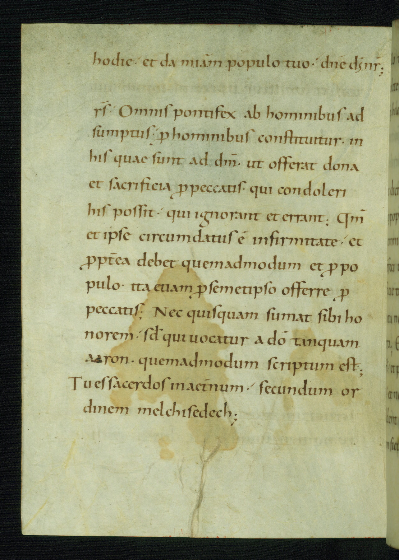 This Lectionary was created ca. 1000 in Trier. Written in a clear Caroline minuscule, it contains decorated initials at the openings of important readings. A set of illuminated letters marks the beginning of the Epistle and Gospel lessons for Easter; they display the hierarchy of scripts with capital letters decorated with gold leaf or drawn in red ink, followed by uncial and Caroline minuscule. Initials in orange, sometimes filled with gold, mark the divisions of the text. The book has been stylistically compared with Ottonian manuscripts, especially with a Psalter preserved in Trier (Stadtbibliothek, Ms. 7) illuminated by the so-called Master of the Registrum Gregorii.