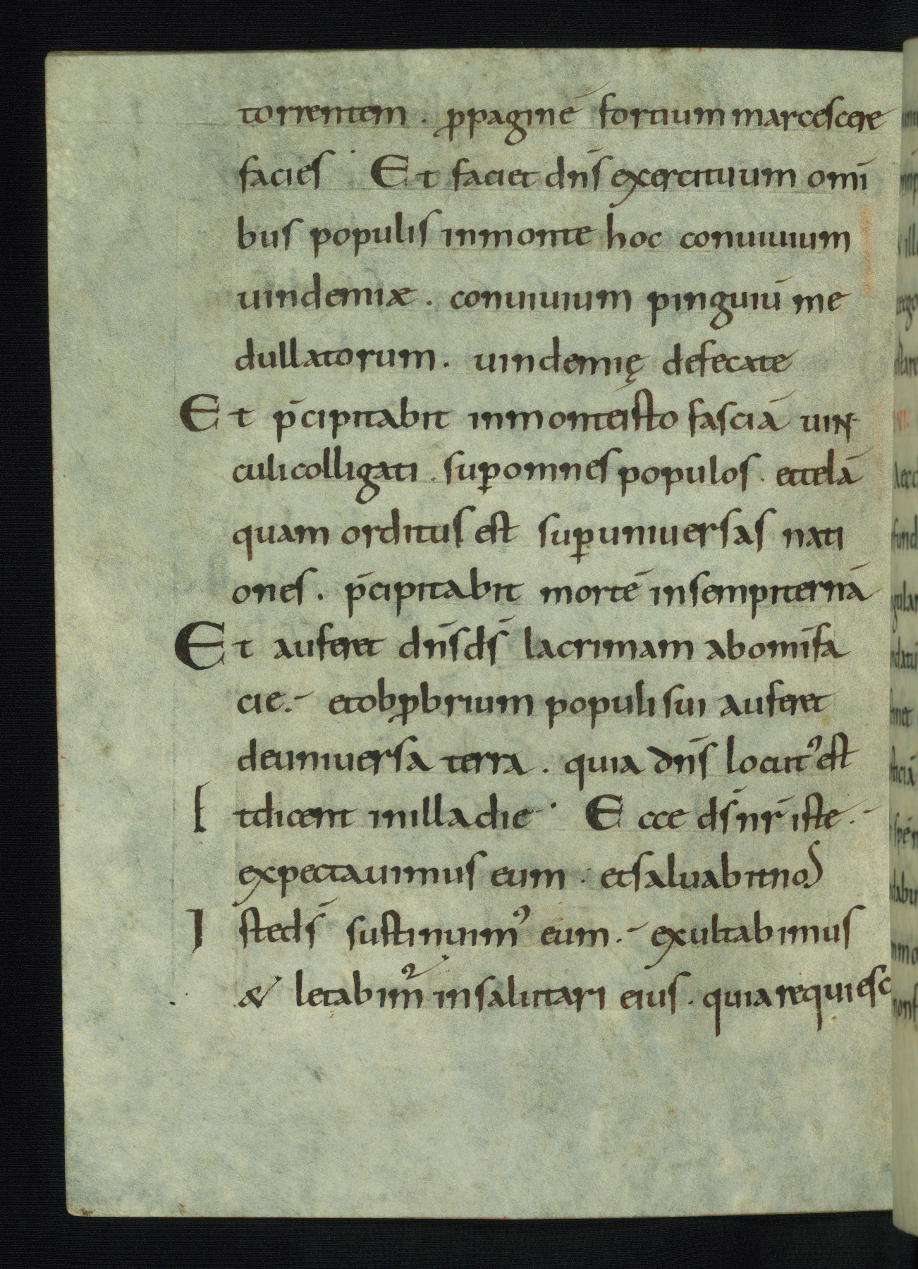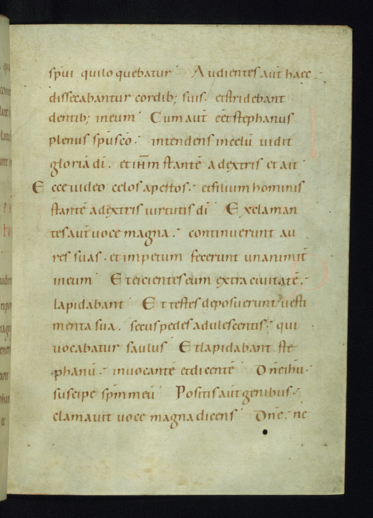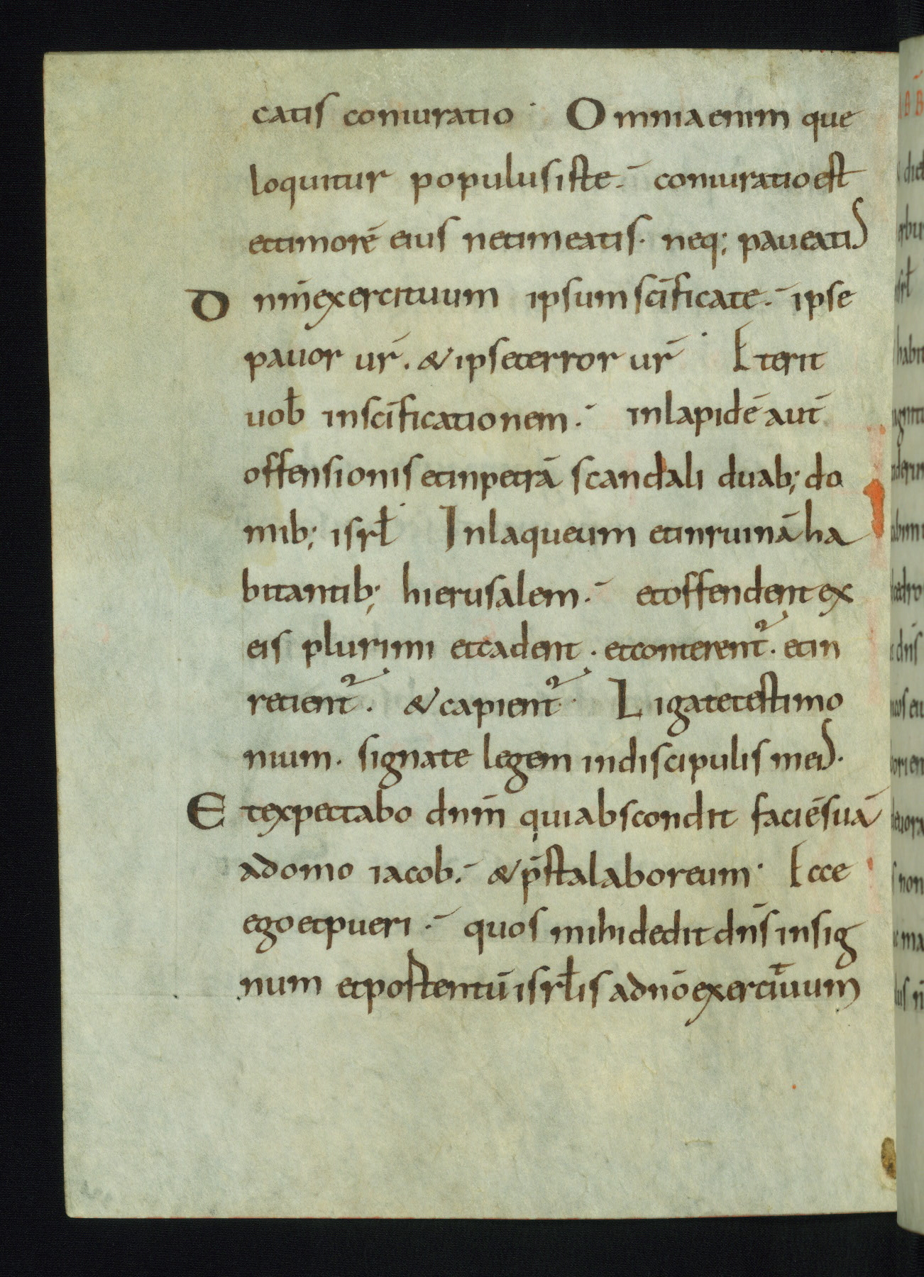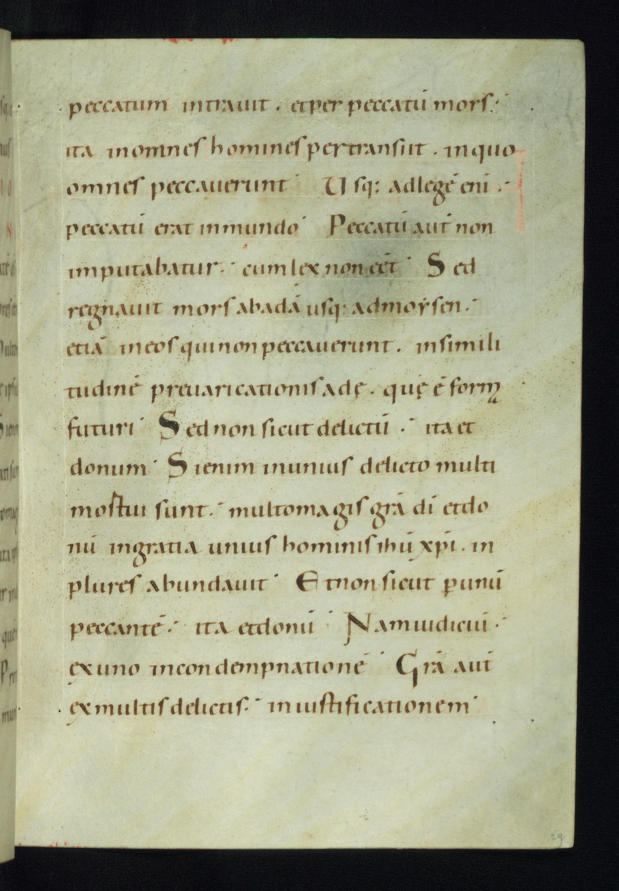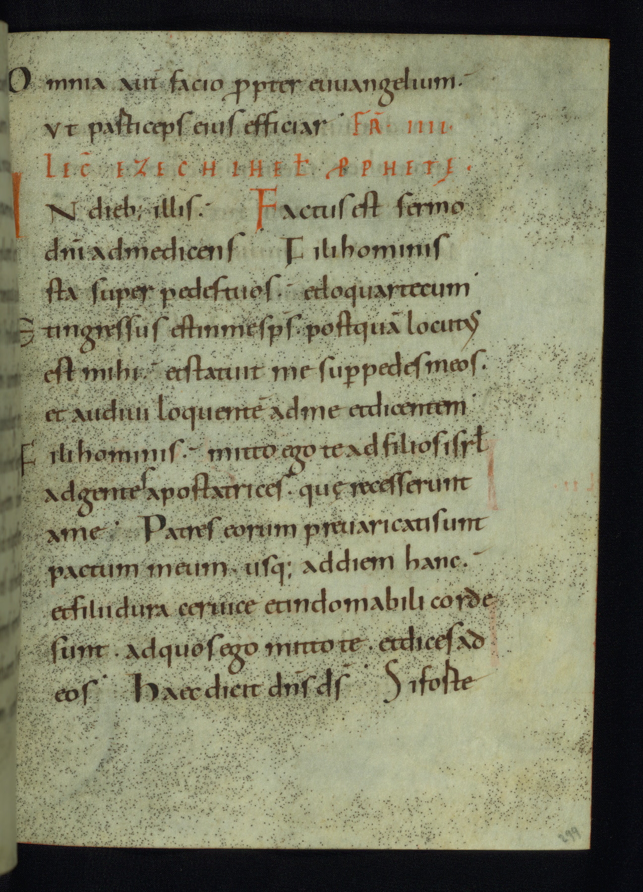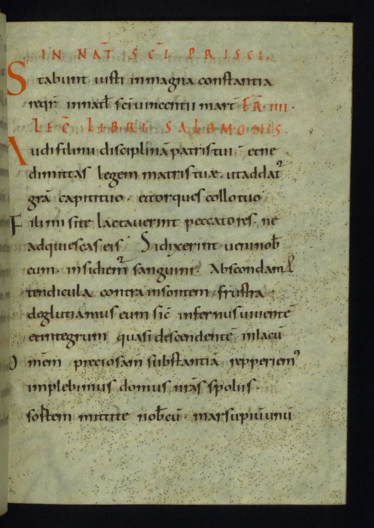 This Lectionary was created ca. 1000 in Trier. Written in a clear Caroline minuscule, it contains decorated initials at the openings of important readings. A set of illuminated letters marks the beginning of the Epistle and Gospel lessons for Easter; they display the hierarchy of scripts with capital letters decorated with gold leaf or drawn in red ink, followed by uncial and Caroline minuscule. Initials in orange, sometimes filled with gold, mark the divisions of the text. The book has been stylistically compared with Ottonian manuscripts, especially with a Psalter preserved in Trier (Stadtbibliothek, Ms. 7) illuminated by the so-called Master of the Registrum Gregorii.