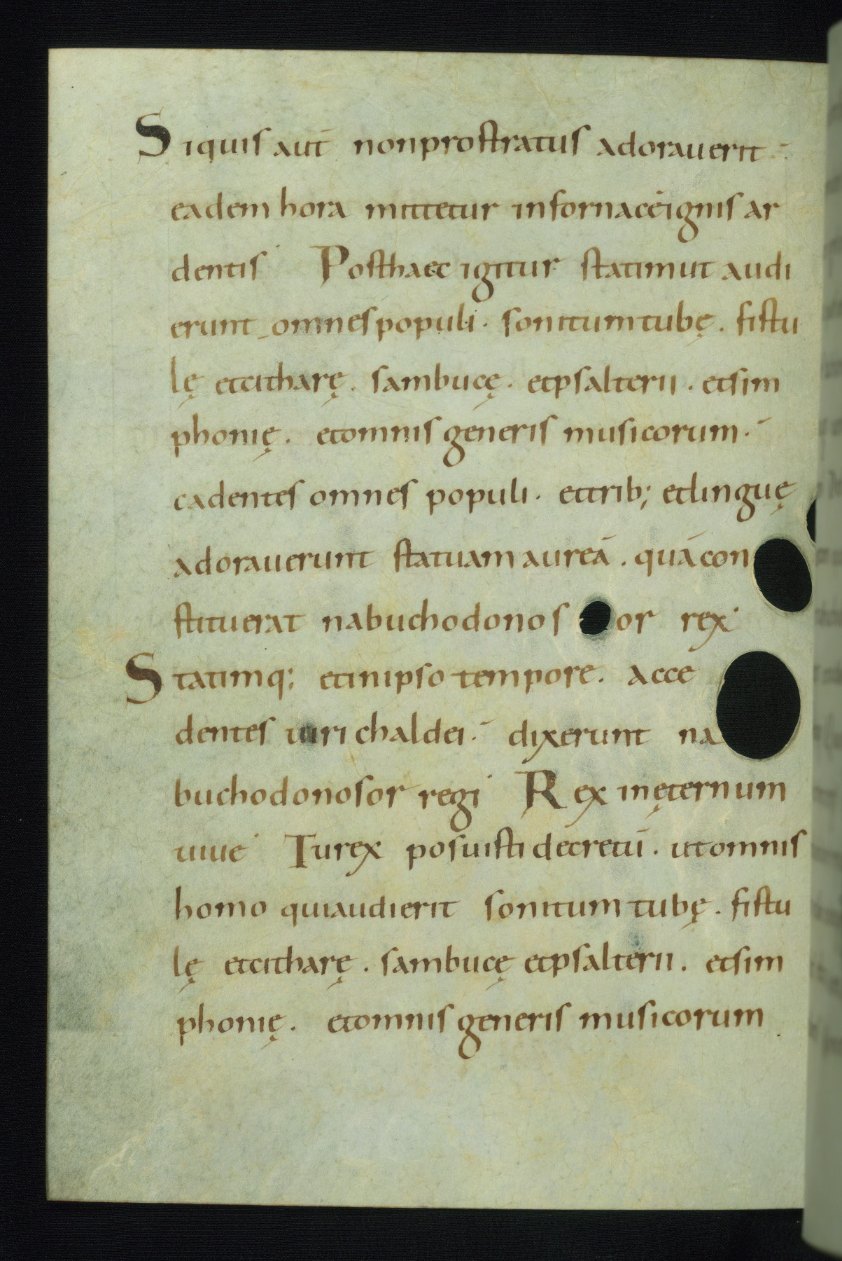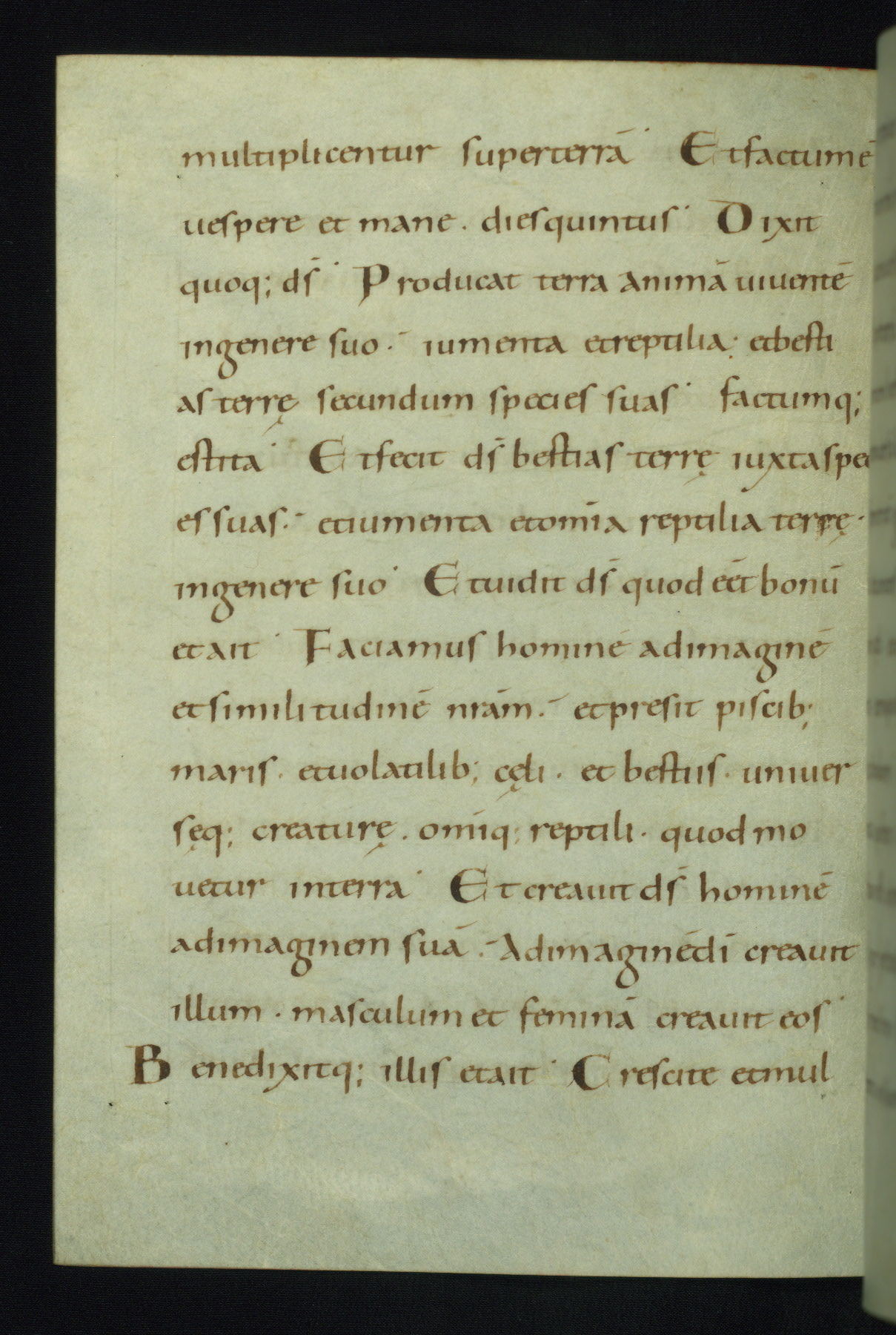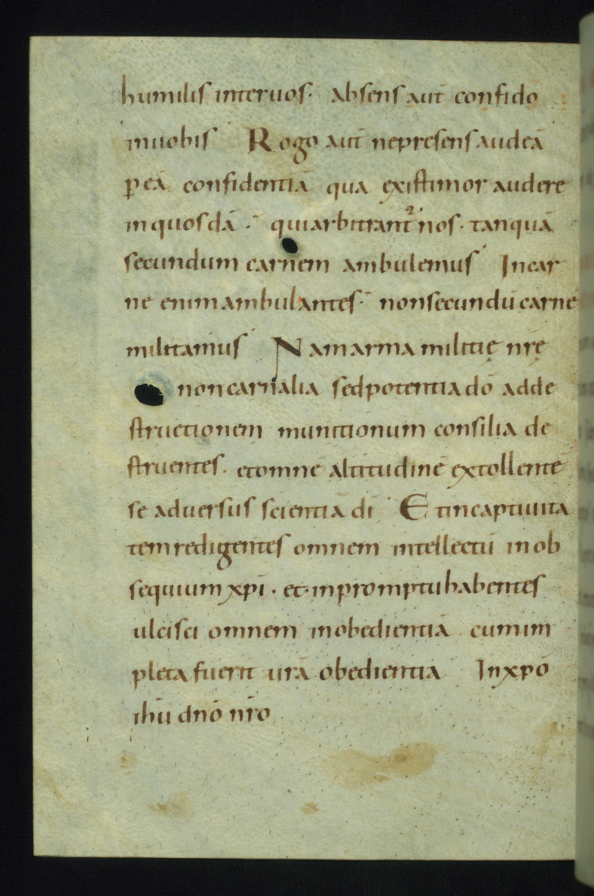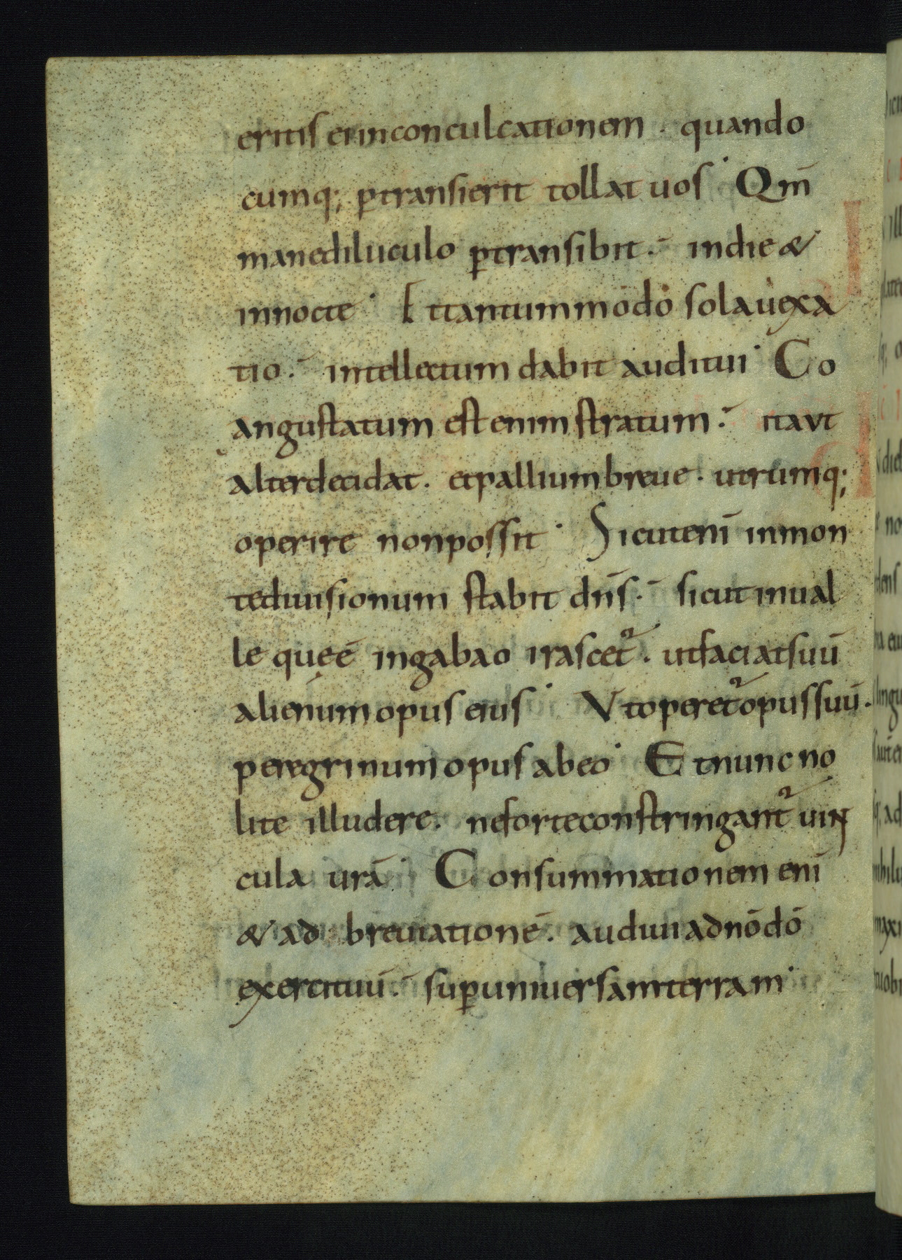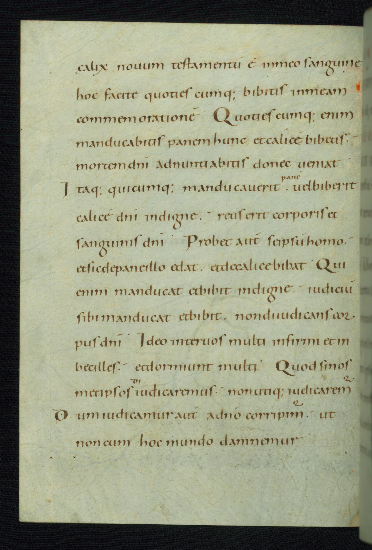 This Lectionary was created ca. 1000 in Trier. Written in a clear Caroline minuscule, it contains decorated initials at the openings of important readings. A set of illuminated letters marks the beginning of the Epistle and Gospel lessons for Easter; they display the hierarchy of scripts with capital letters decorated with gold leaf or drawn in red ink, followed by uncial and Caroline minuscule. Initials in orange, sometimes filled with gold, mark the divisions of the text. The book has been stylistically compared with Ottonian manuscripts, especially with a Psalter preserved in Trier (Stadtbibliothek, Ms. 7) illuminated by the so-called Master of the Registrum Gregorii.