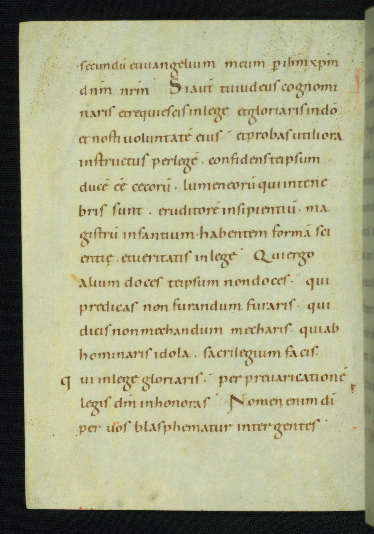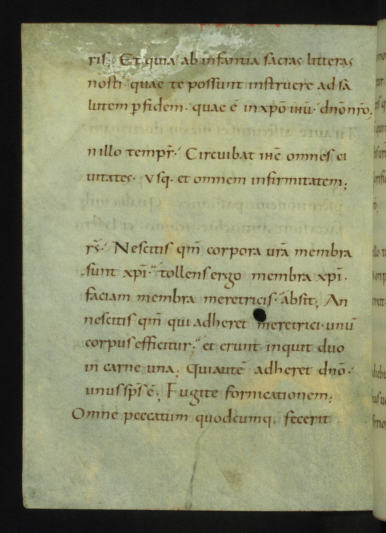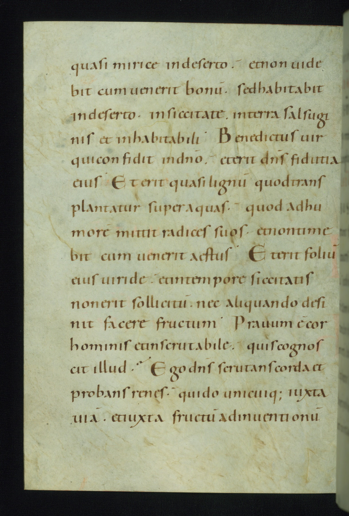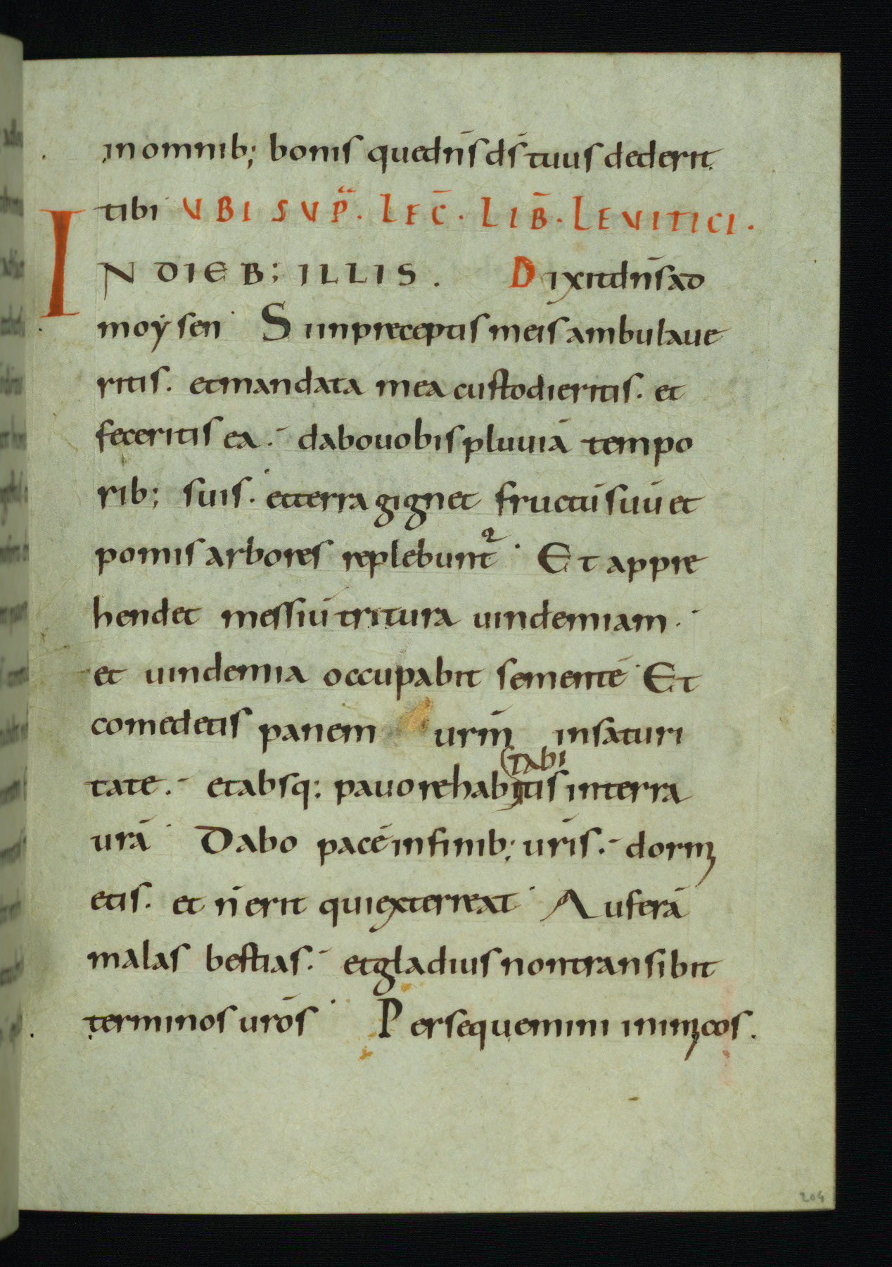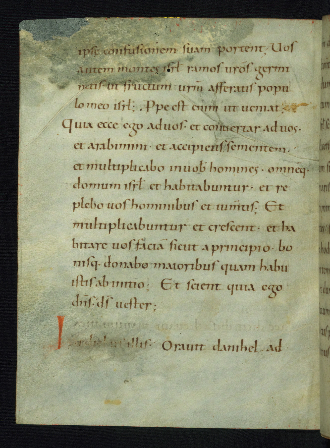This Lectionary was created ca. 1000 in Trier. Written in a clear Caroline minuscule, it contains decorated initials at the openings of important readings. A set of illuminated letters marks the beginning of the Epistle and Gospel lessons for Easter; they display the hierarchy of scripts with capital letters decorated with gold leaf or drawn in red ink, followed by uncial and Caroline minuscule. Initials in orange, sometimes filled with gold, mark the divisions of the text. The book has been stylistically compared with Ottonian manuscripts, especially with a Psalter preserved in Trier (Stadtbibliothek, Ms. 7) illuminated by the so-called Master of the Registrum Gregorii.