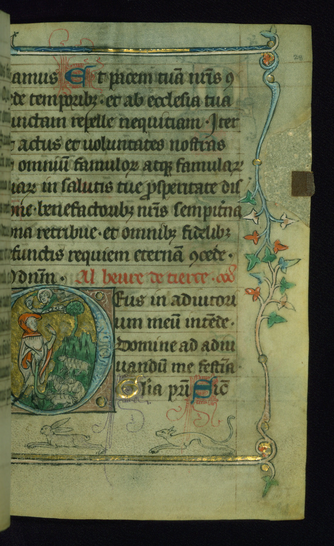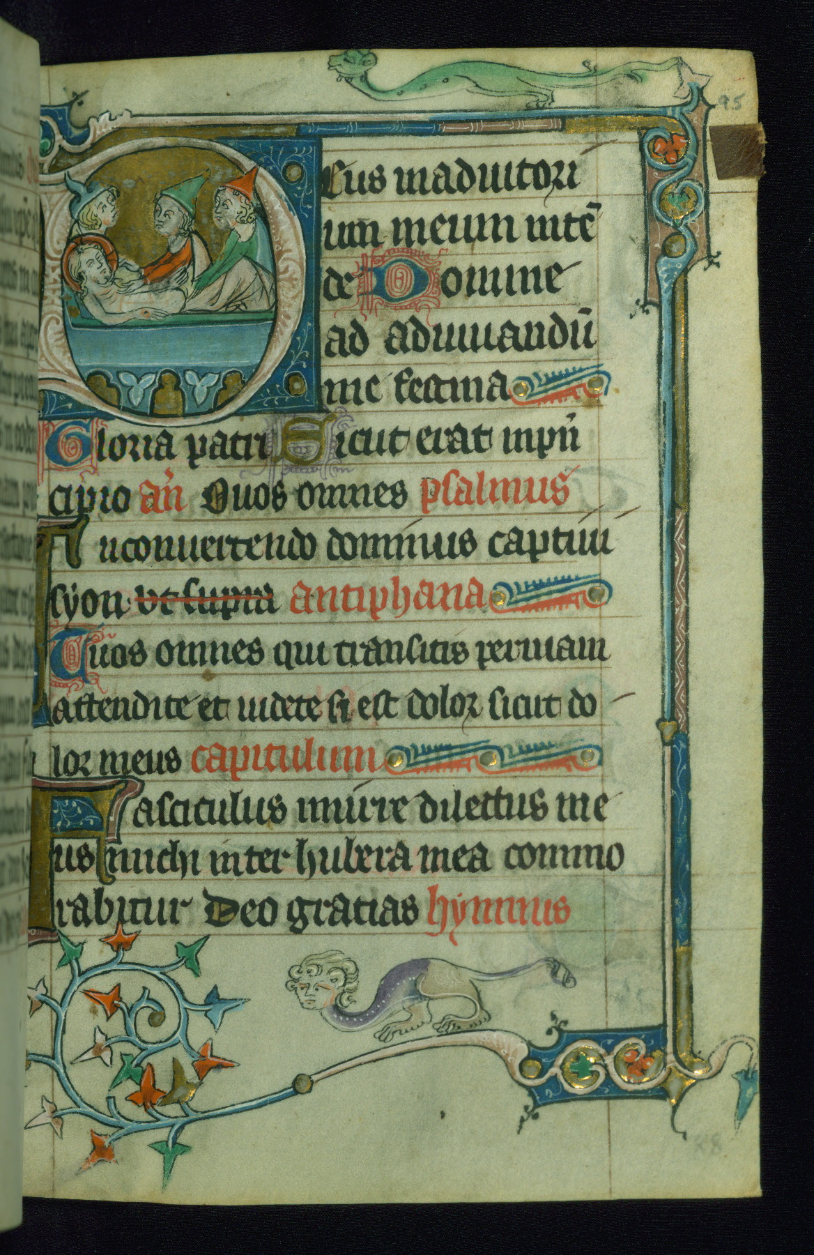 - Decoration note: Six historiated initials and drolleries mark the hours on fols. 8r, 15r, 24v, 28r, 31v, 41r