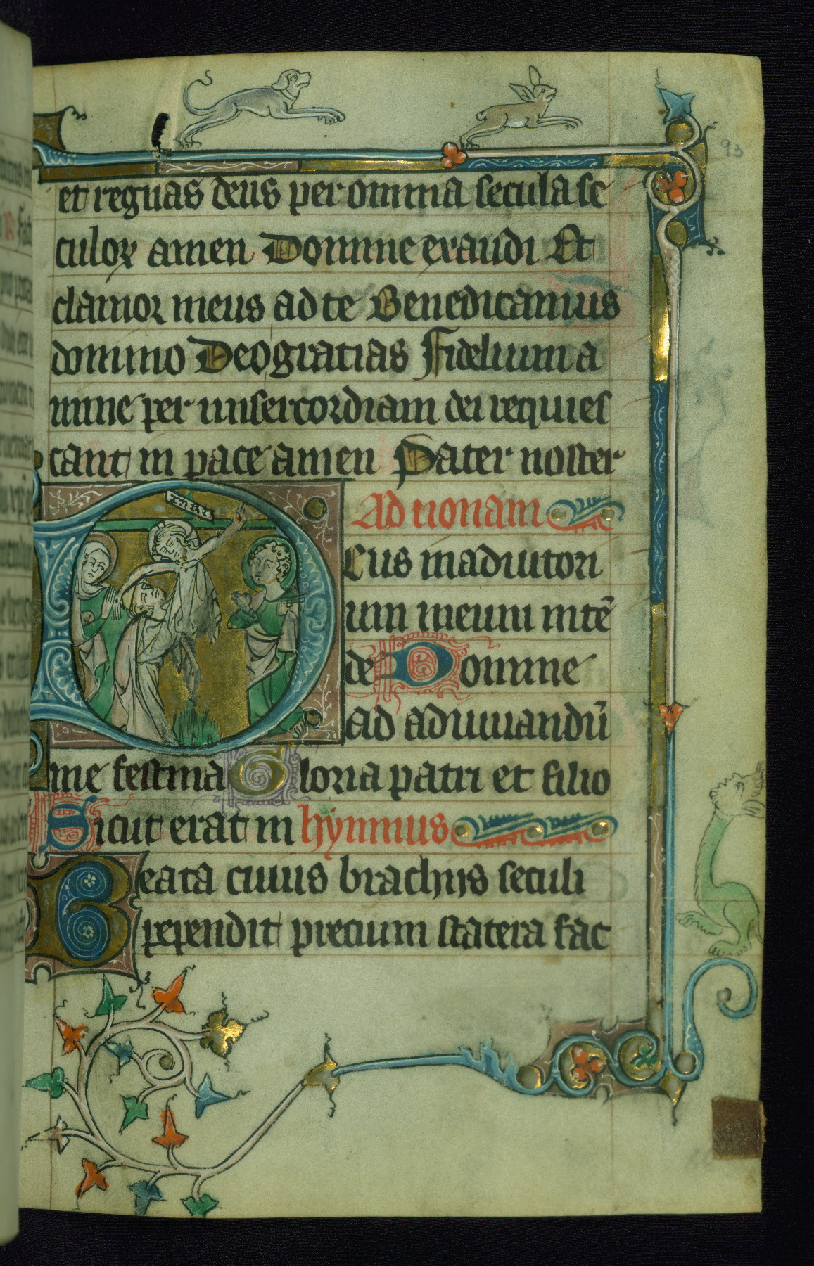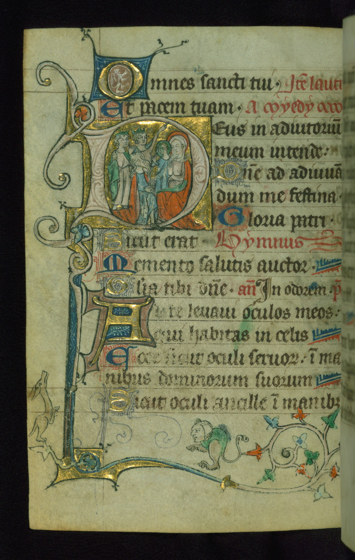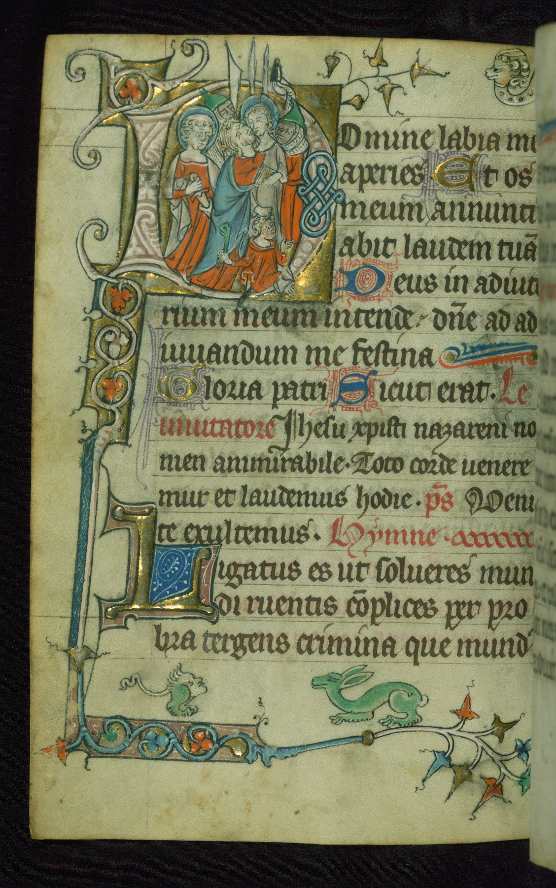 - Decoration note: One historiated gold initial on fol. 116v, and drolleries for the beginning of the Hours; gold initials inhabited by animals or nomina sacra (2 to 3 lines)