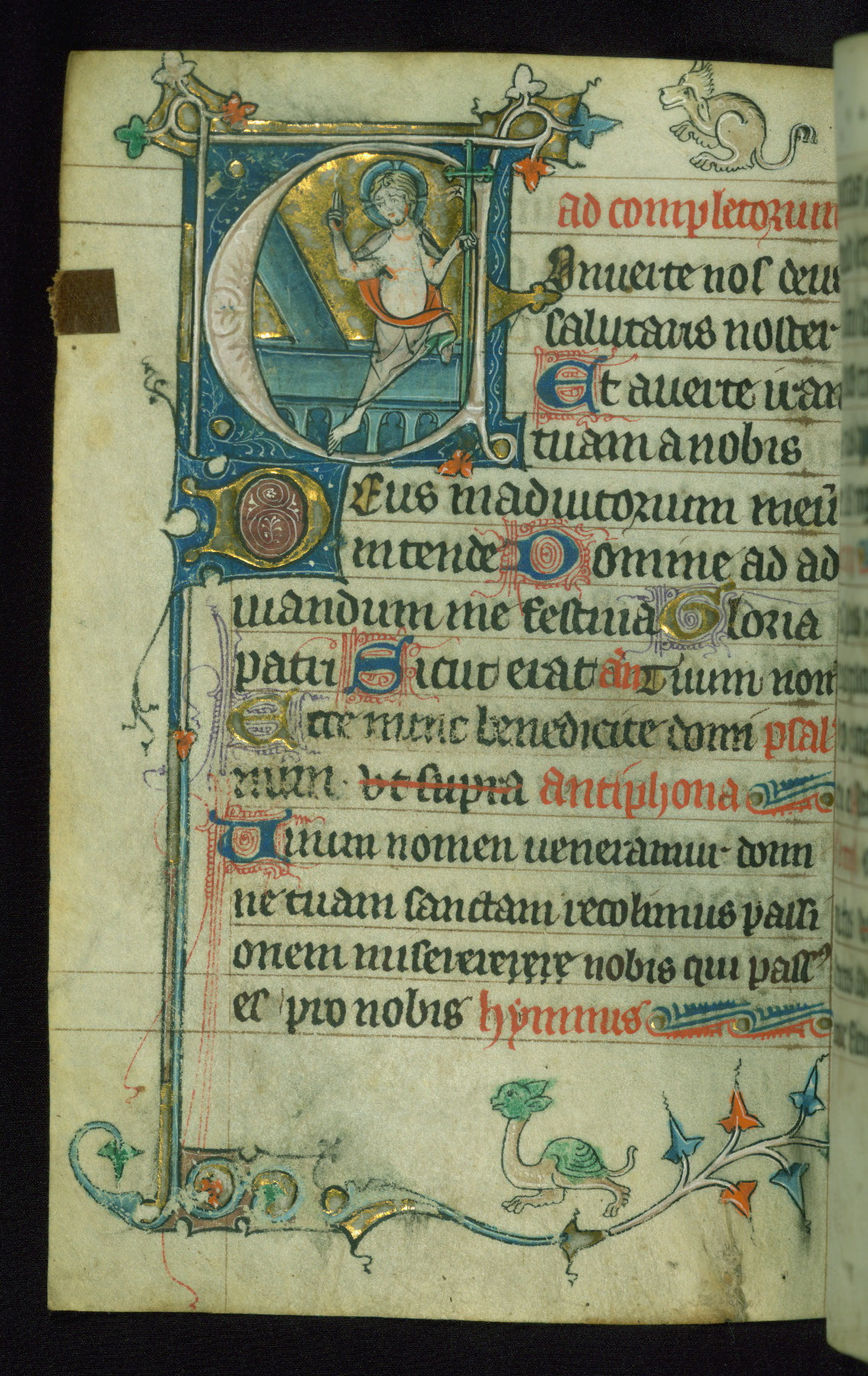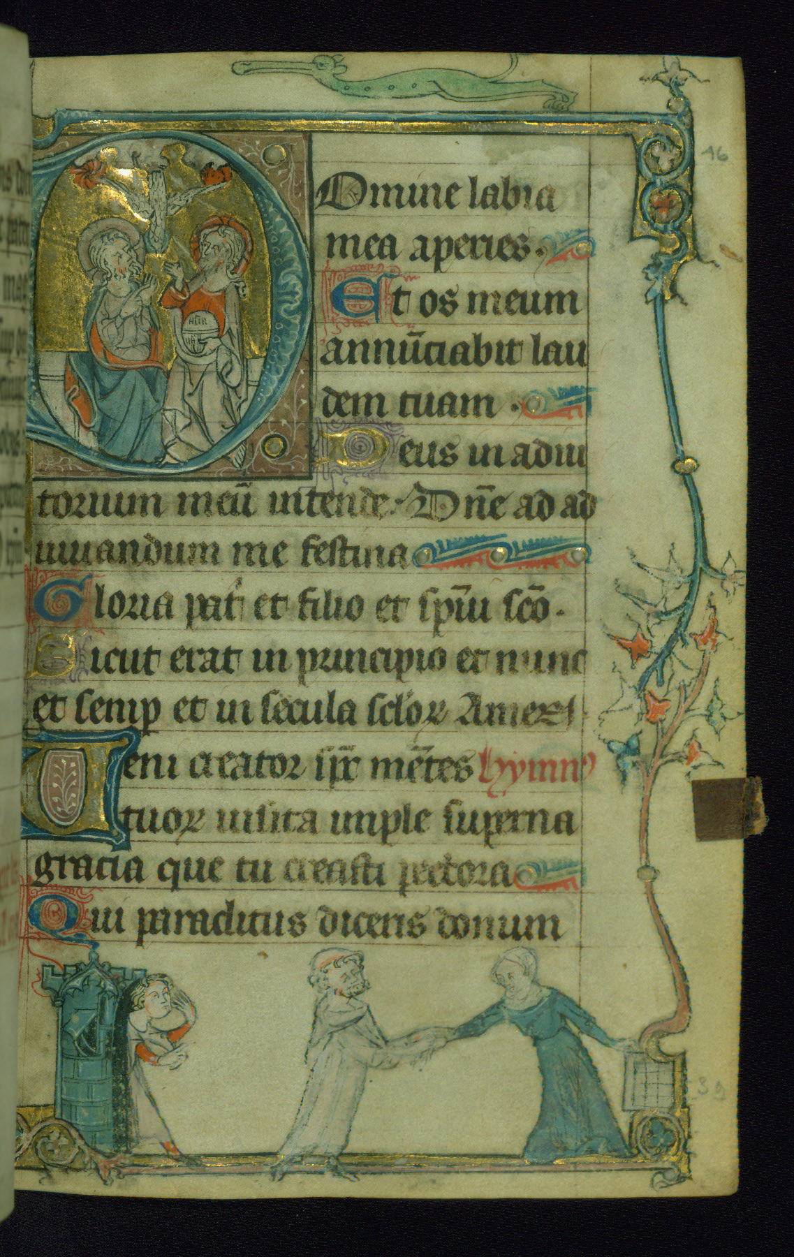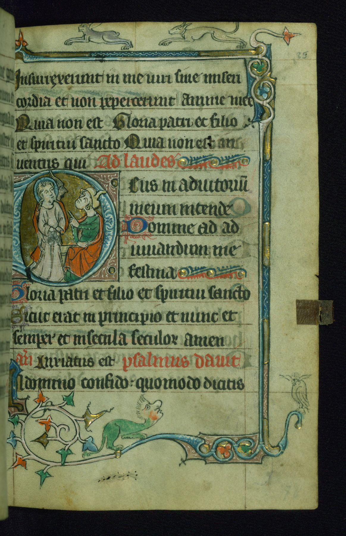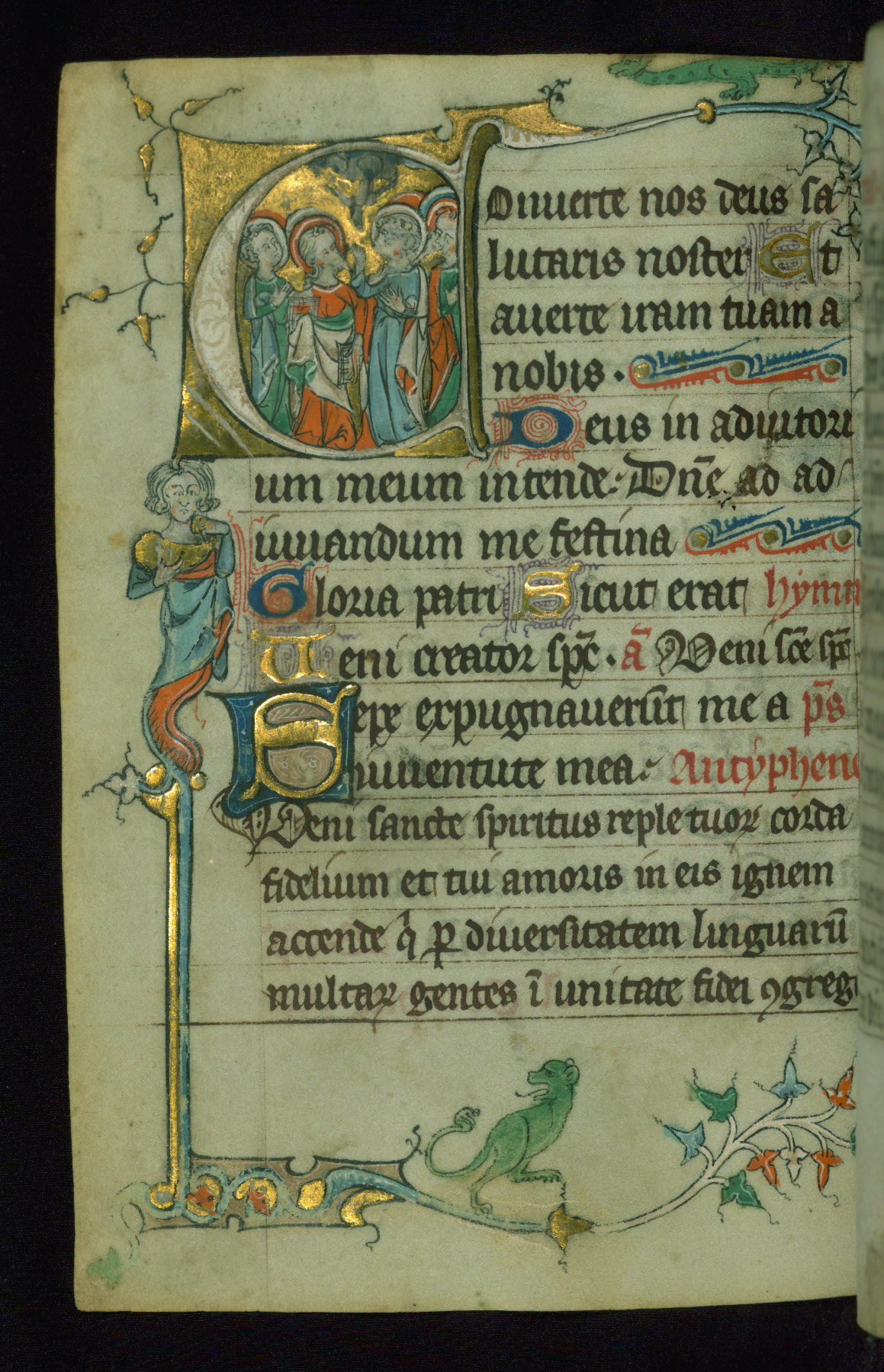 - Decoration note: One historiated gold initial on fol. 116v, and drolleries for the beginning of the Hours; gold initials inhabited by animals or nomina sacra (2 to 3 lines)