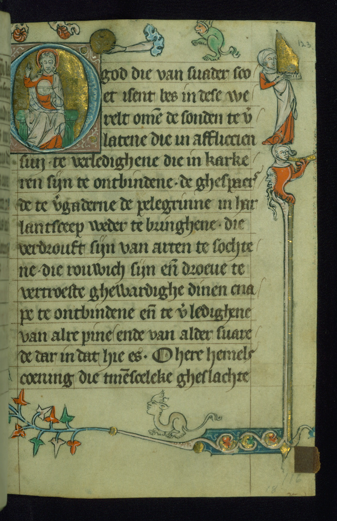 - Decoration note: One gold historiated initial on fol. 123r, and drolleries